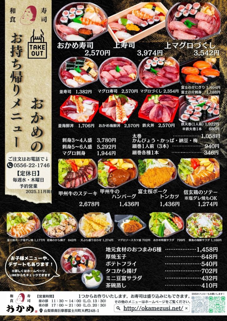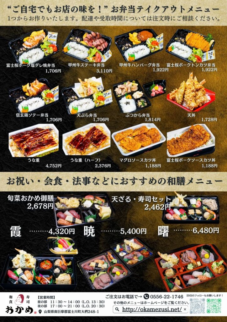 寿司・和食おかめでは、グランドメニューの全メニューがテイクアウトできます!
